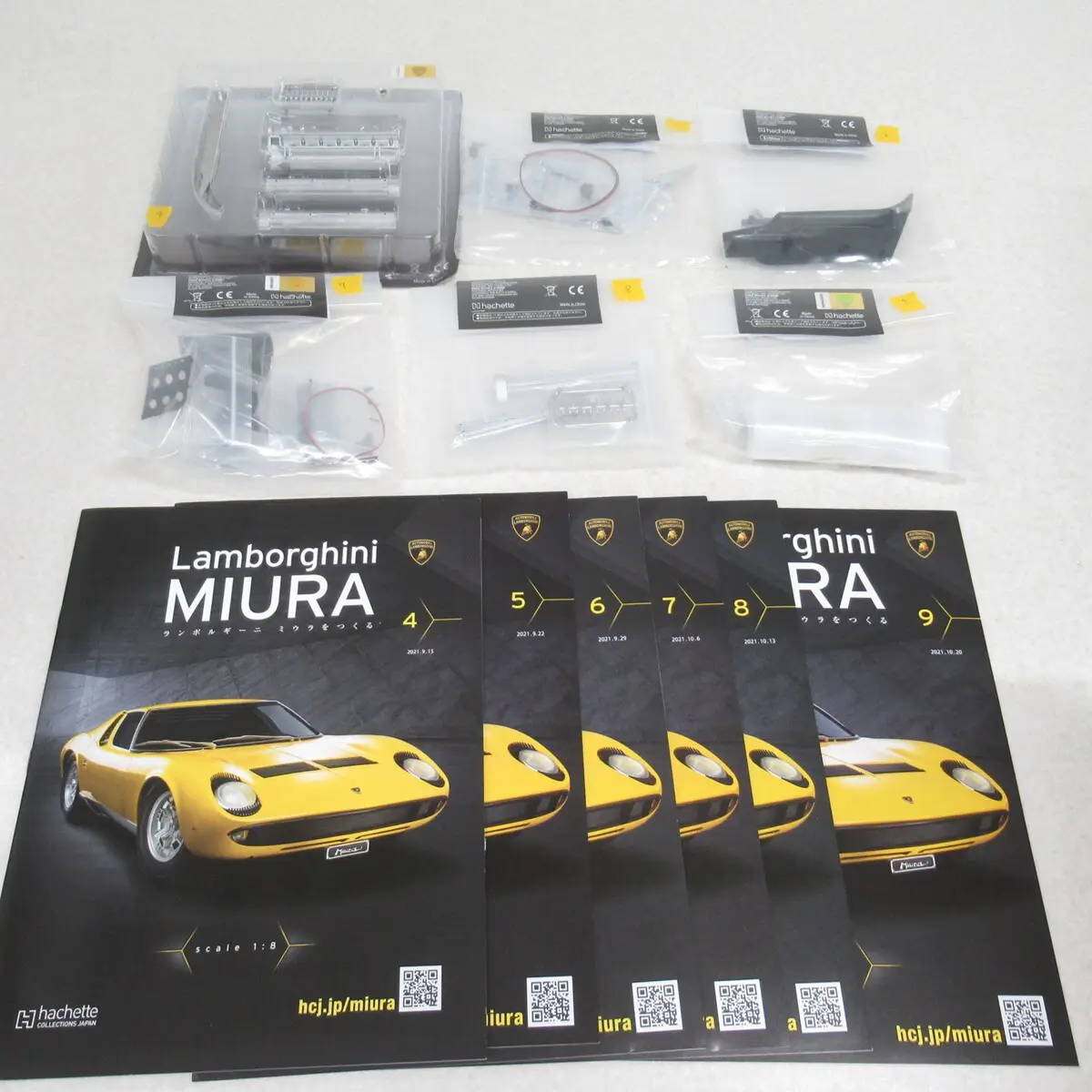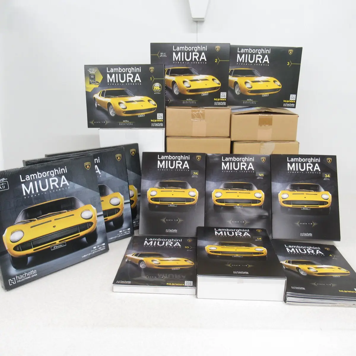 アシェットが2021年から2023年にかけてリリースした分冊百科、『ランボルギーニ ミウラをつくる』をお譲りいただきました。本体は未組立。全100号+延長分10号のビルドアップタイプで、100号まで集めると1/8スケールのランボルギーニミウラが完成します。