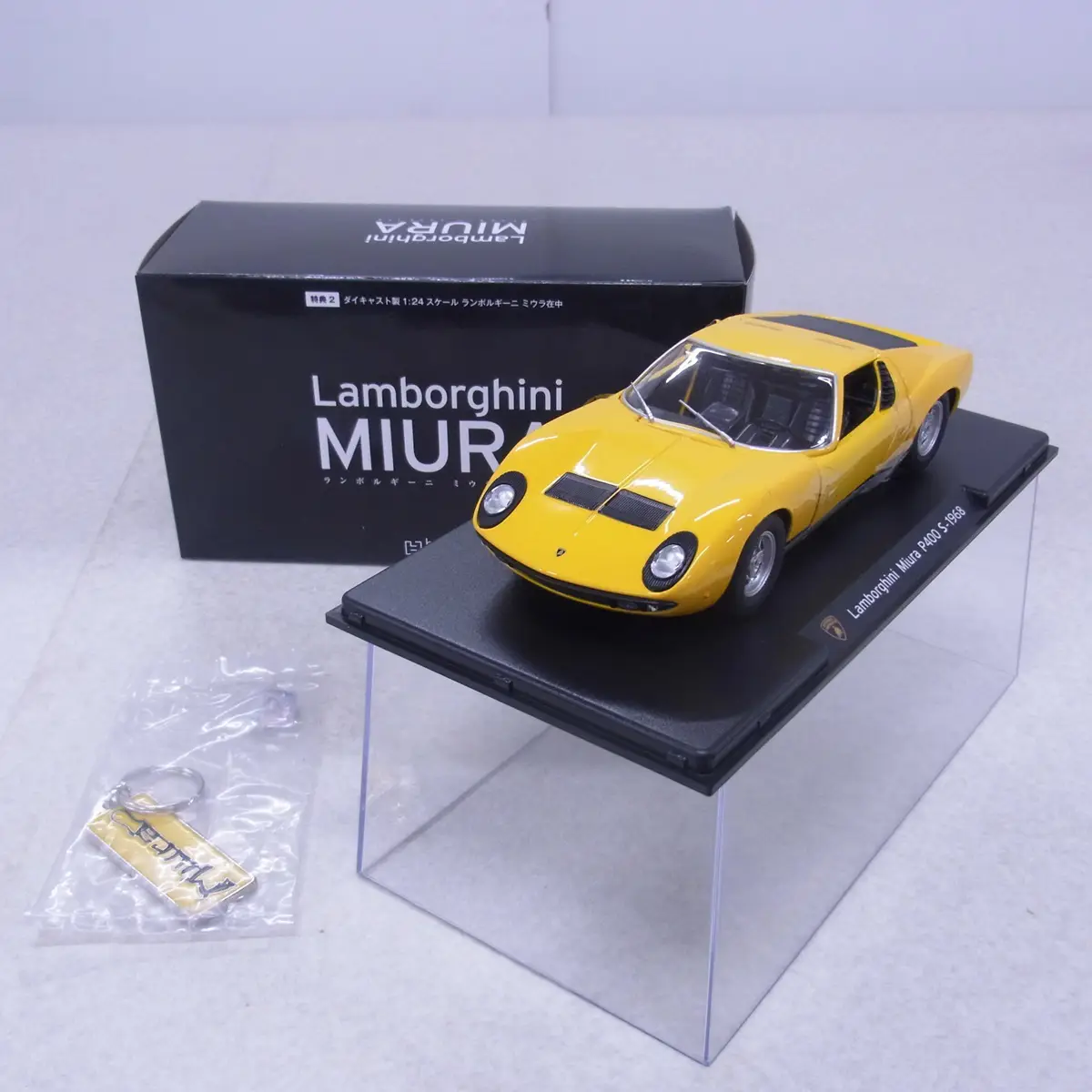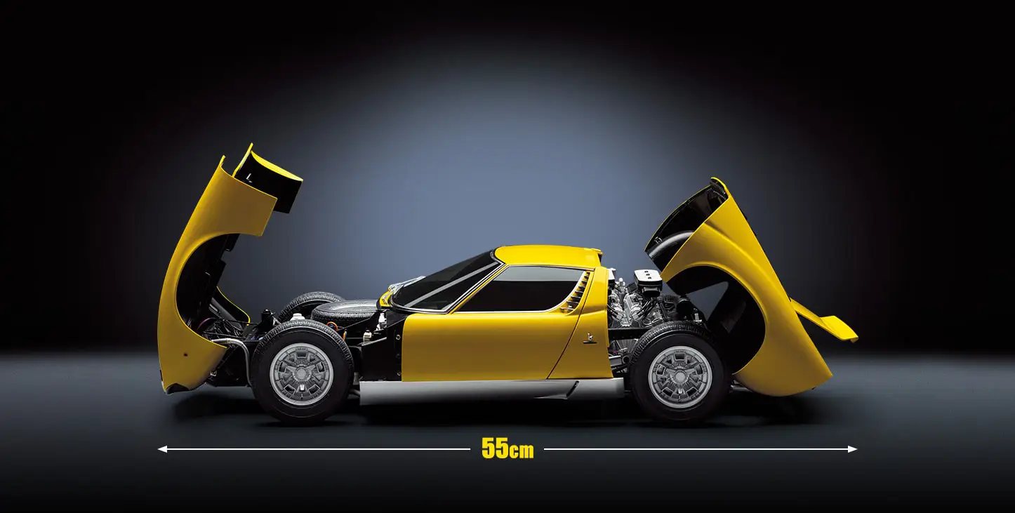 アシェットのミウラは全長55cm、ボディとシャシーは金属製。ドアや各部の開閉、灯火類の発光やイグニッションスタート、加速時のエンジン音などのギミックが盛り込まれています。このへんはアシェットの1/8スケールカーモデルではおなじみですね。