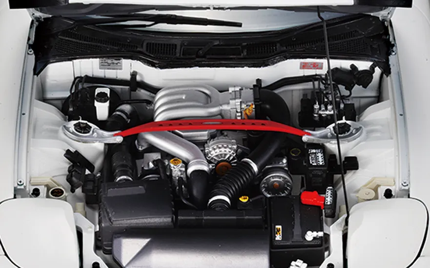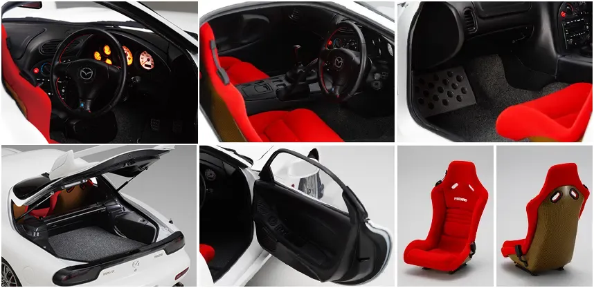 今回モデルアップされた「RX-7 スピリットR(タイプA)」は、RX-7の生産終了を記念した特別限定モデル。4シーター4速ATの「タイプC」、4シーター5速MTの「タイプB」といったラインナップの中で、最もスパルタンな2シーター5速MT、専用のレカロ社フルバケットシート装備モデルです。この日本のスポーツカーの金字塔ともいえるモデルを23年の時を経て、最先端の技術で3Dスキャン。流麗なデザインと細部のディテールを余すところなく1/8スケールで完全再現しています。