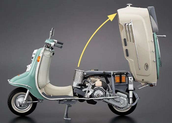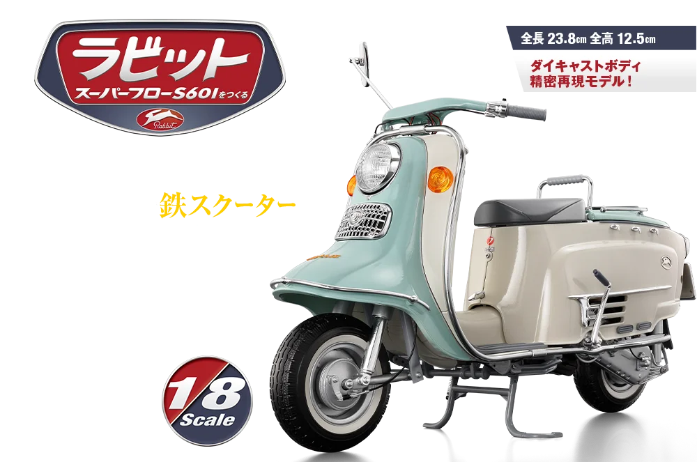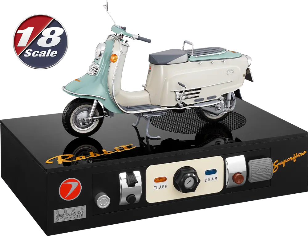 モチーフとなったラビット スーパーフローS601は、終戦直後の1946年から富士重工業(現:スバル)が開発・販売をスタートさせたラビットスクーターシリーズの1モデルです。第二次世界大戦中は中島飛行機として各種航空機の開発に携わっていた富士重工業(当時は富士産業)は、軍需産業から平和産業へと転身するにあたりスクーターの開発に着手。アメリカ製のパウエル式スクーターを参考として、日本の道路事情などにあわせて開発されました。その試作モデルには大戦中の爆撃機「銀河」の車輪が流用されていたといわれています。