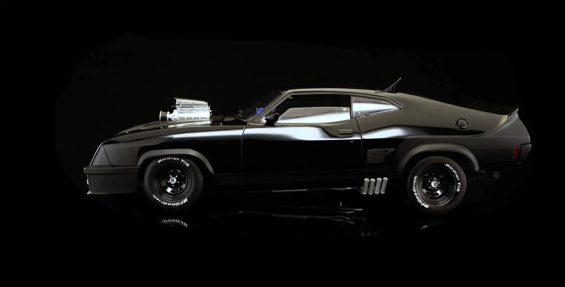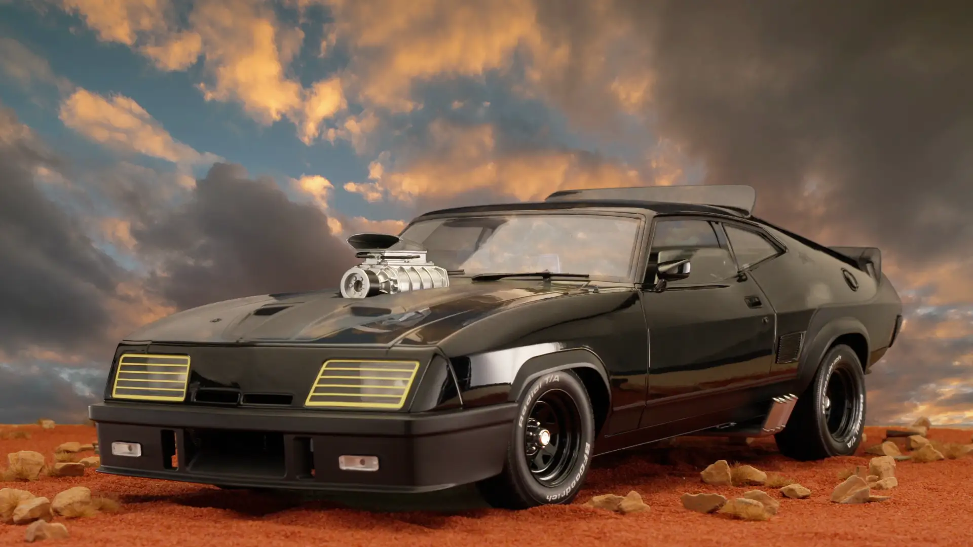 ボンネットから大きく張り出したタスーパーチャージャーと漆黒のボディが特徴。そのインパクトあふれるスタイルは、メル・ギブソン演じるマックスのキャラクターと共に、以降の映像やゲーム作品に多大な影響を与えました。