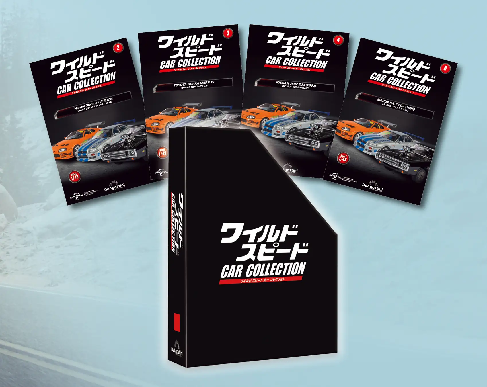 デアゴスティーニではこの作品に登場する車両を、コレクションタイプのパートワークシリーズ化。隔週刊ペースでリリースされる、マガジンと1/43スケールのダイキャストミニカーのセットです。ダイキャストミニカーは劇中のカスタマイズ箇所や、派手なカラーリングやプリントを再現しています。