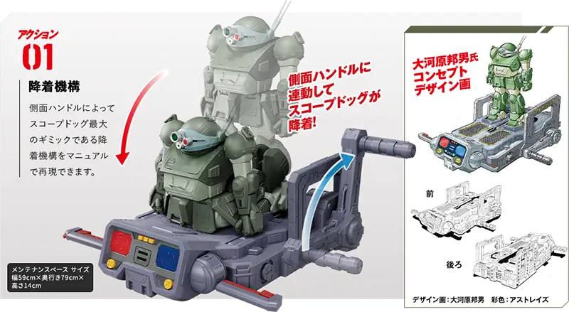 さらに今回アシェットでは、スコープドッグをデザインした大河原邦男氏による専用メンテナンスベースを新たに開発。1/8スコープドッグ本体をセットすることで、ハンドルと連動した降着ポーズギミックや、ボタンやレバー操作によるターレットレンズの回転、移動、バイザー開閉、本体の前傾などのアクションを楽しむことができます。