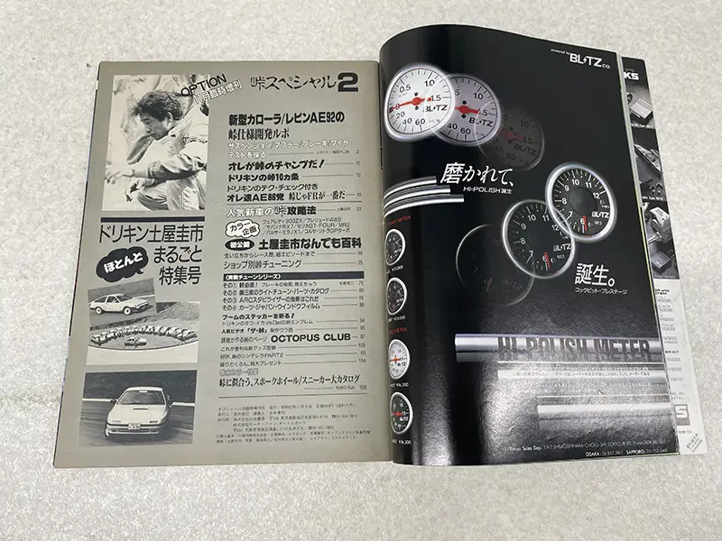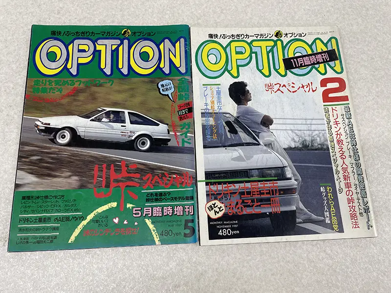 この時期の『OPTION』本誌は、ご存知、稲田大二郎氏のもと、最高速度・最高出力重視のチューンナップ、特化した内容でした。忘れてはいけない、ゼロヨンもありましたね。そのため「峠スペシャル」は臨時増刊という形で発行されたものと思われます。5月増刊号のメイン車両がFRのAE86ですが、実はまさにこの年の5月にレビン/トレノはFFのAE92へと代替わりしています。そこで11月増刊号のメインはAE92となっているのも時代とフットワークの軽さを感じますね。もっともAE86が未だに愛され、GR86に繋がっているのは、皆様ご存知の通りです。
